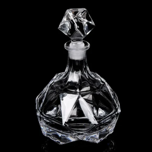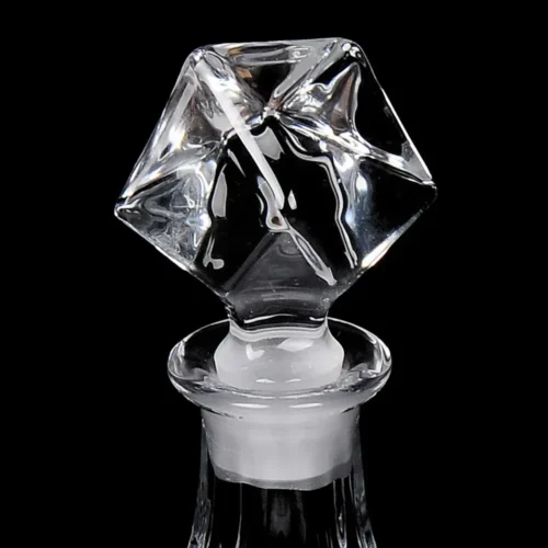 – Matériaux : verre épais et transparent, bouchon facetté en verre rodé