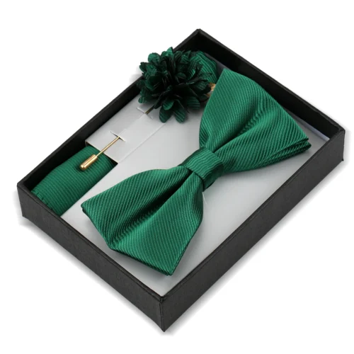 Exprimez une élégance intemporelle avec le set « Silvan » vert émeraude : nœud papillon pré-noué, pochette assortie et boutonnière, présentés dans leur écrin raffiné.